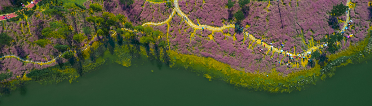 紅花依碧水,仙湖早爭春。在北方正冰天雪地的時候,云南澄江撫仙湖畔卻紅翠相染,山花爛漫,依舊溫暖如春。冬櫻花與綠樹、藍天、碧水,共同構成一幅色彩斑斕的山水畫卷。