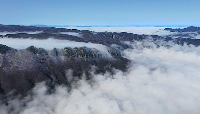 張家界永定區七星山的莽莽群山銀裝素裹,云霧在雄奇險峻的山峰之間纏繞升騰,雪鋪陳在巨大雄渾的臺型地貌上,猶如漫無邊際的白色綢緞,整個七星山就像一幅奇幻風格的CG插畫,讓人震撼。